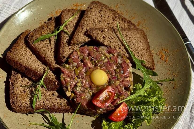 Яловичина, каперси, оливки, перепелине яйце, цибуля, вустерський соус, тости.