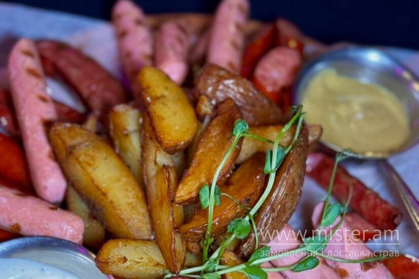 Ковбаски: кабаноси, бельгійські, мисливські, картопля по-селянськи, соуси: гірчиця, часниковий.