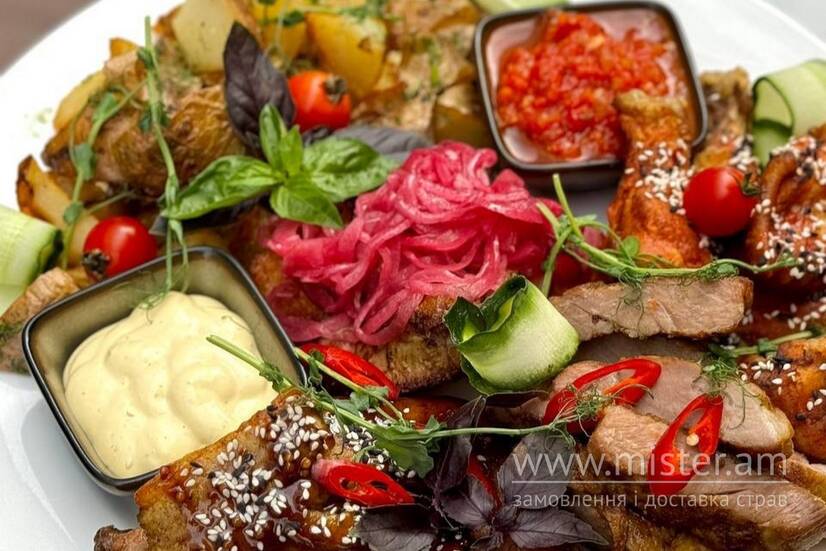 Ошийок, реберця, крильця, пів курча, картопля по-селянськи, маринована цибуля, соуси: аджика, часниковий.