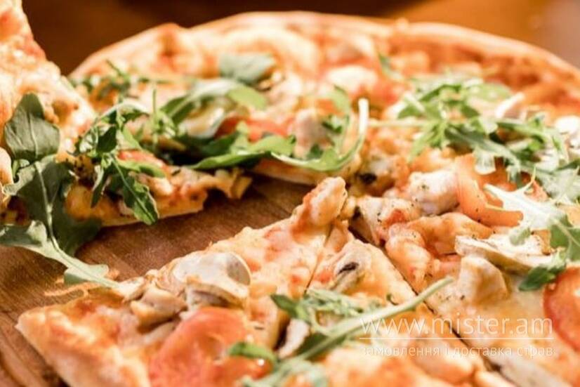 Філе курча, печериці, томати, сир моцарела, томатний соус.