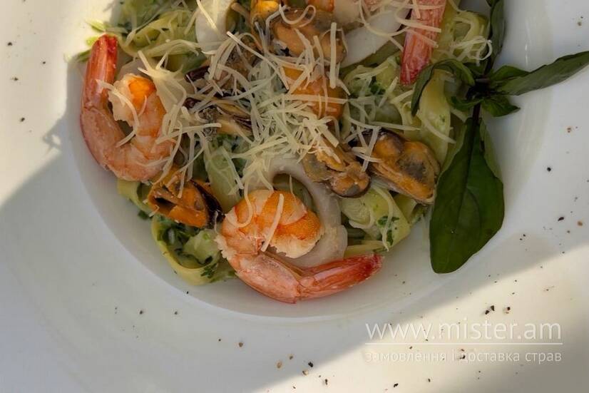 Паста, мідії, кальмари, креветки, соус пілаті, пармезан.