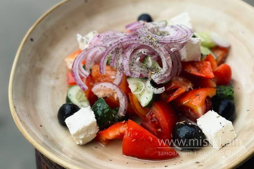 Огірок, помідор, перець болгарський, маслини, сир фета, цибуля, оливкова олія.