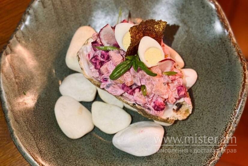 Картопля, морква, буряк, оселедець, яблуко, цибуля, яйце перепелине, майонез.