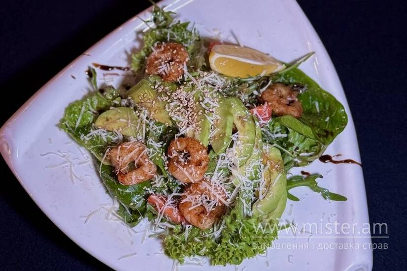 Мікс салату, креветки, авокадо, чері, пармезан, соус медово-гірчичний.