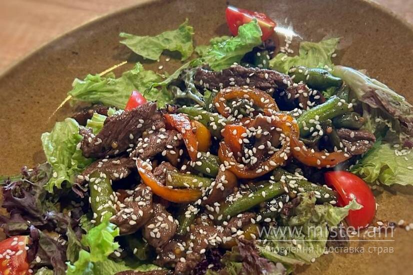 Мікс салату, яловичина, печериці, перець болгарський, стручкова квасоля, чері, кунжут, медово-гірчичний соус.