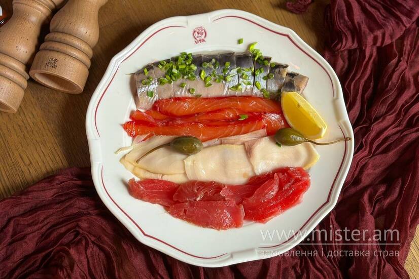 Лосось гравлакс, масляна, слабосолоний тунець та оселедець власного посолу.