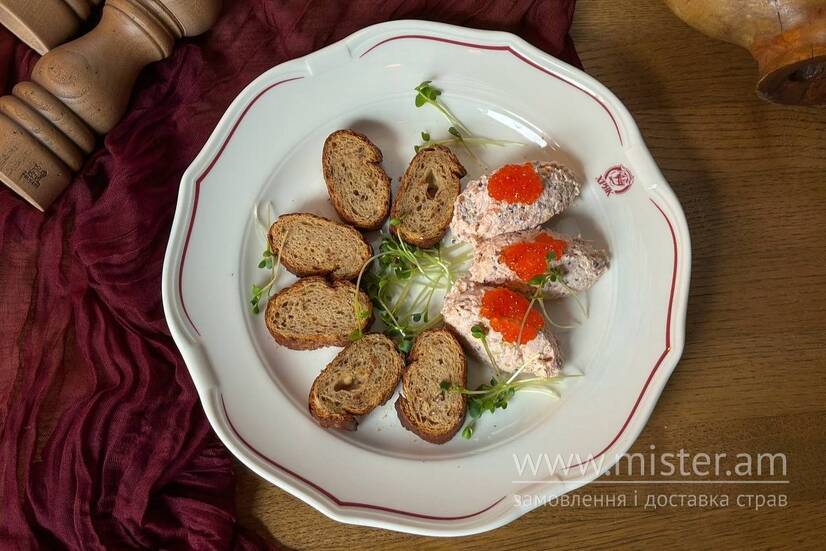 Лосось гарячого копчення з вершками, червоною ікрою та хрусткими грінками.