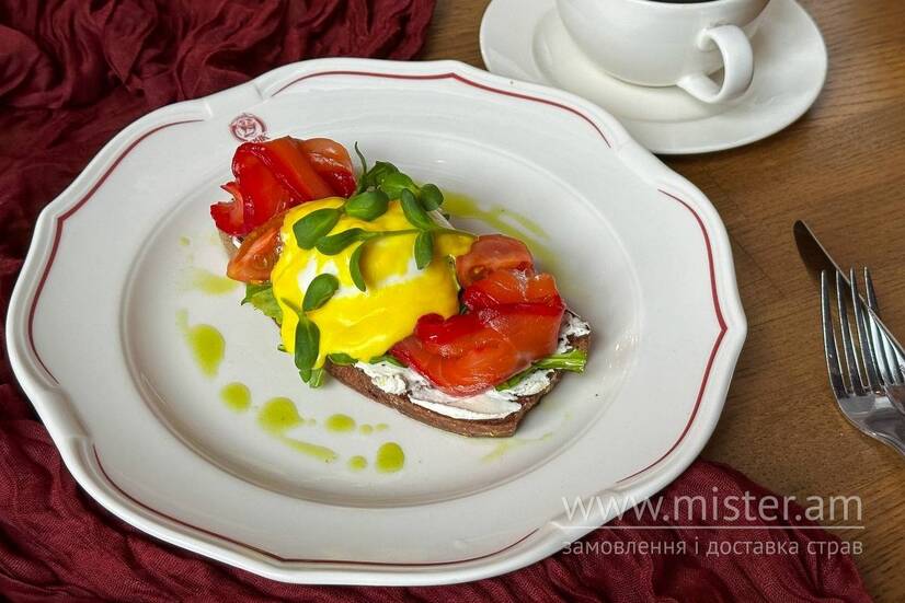 Хрустка основа, ніжний лосось і кремове яйце, об’єднані вершковим голандезом, дарують насолоду з кожним шматочком.
