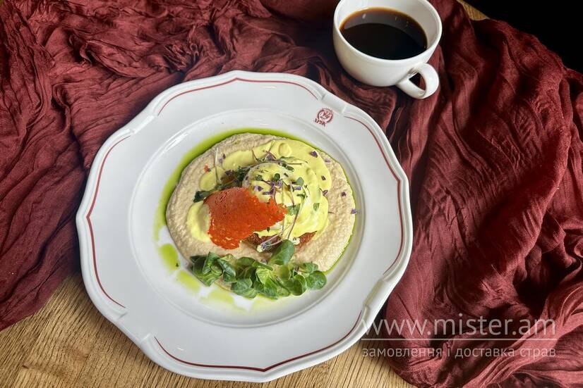 Соковита котлета з індички подається на хумусі, зверху яйце пашот та сирний соус.