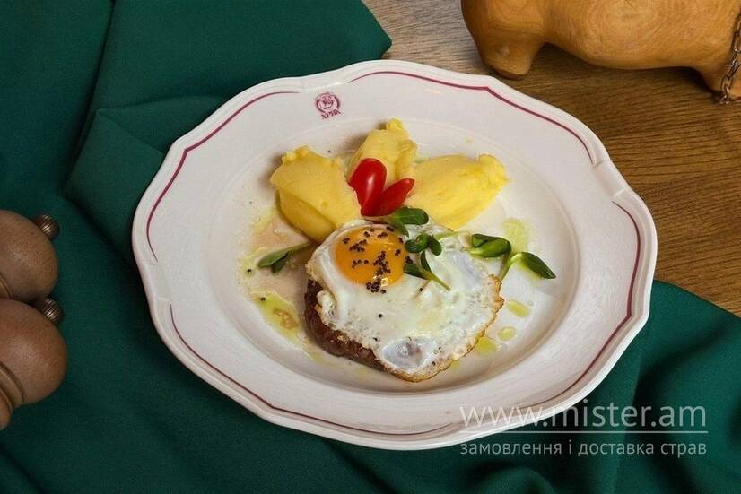 Соковита котлета зі свино-яловичого фаршу, подаємо з картоплею пюре.