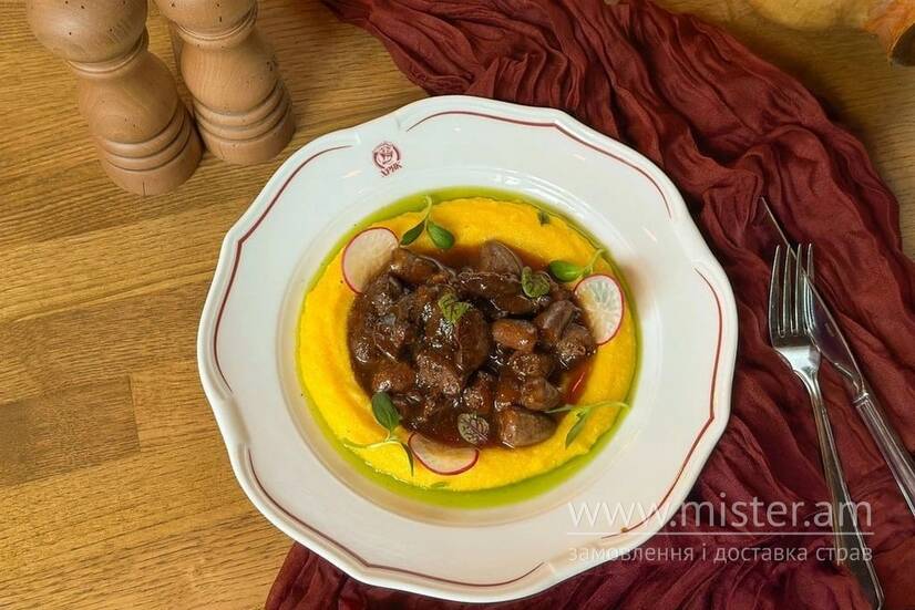 Кремова полента з ароматними курячими серцями та шлунками, що роблять страву одночасно ніжною й ситною.