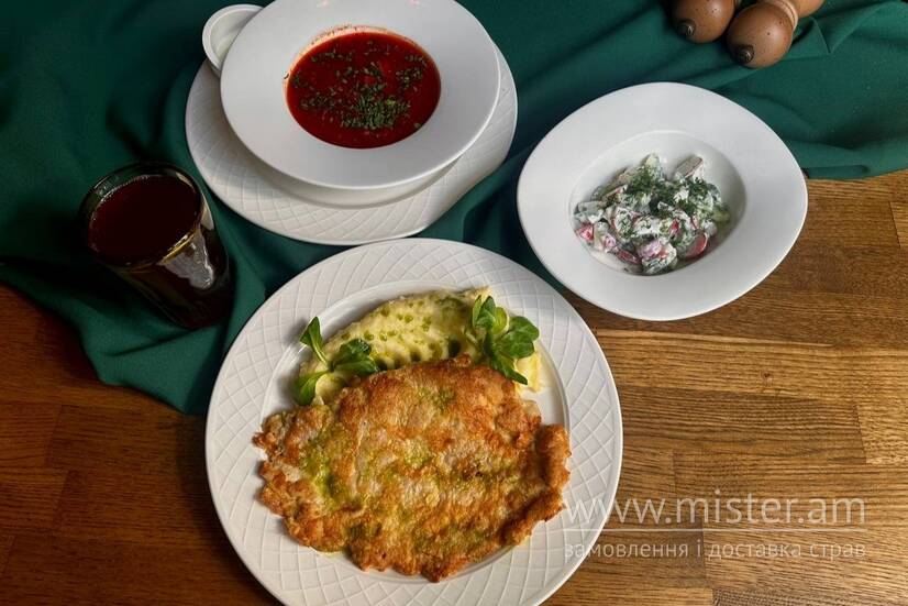 - відбивна зі свинини з картопляним пюре;