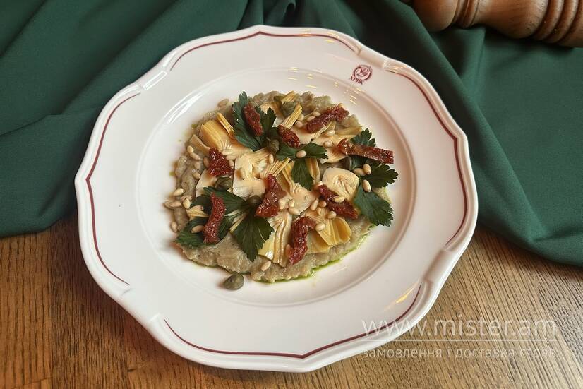 Ніжні артишоки подаються на кремовій основі з баклажанів, в'ялені томати додають легкої пікантності.