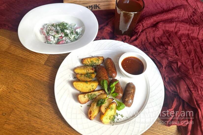 - запечена картопля з ковбасками хряка;