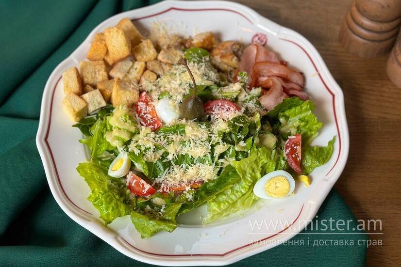 Поєднання хрусткого ромену, ніжного курячого філе, крутонів та пармезану, залитих легким і кремовим соусом на основі вершків та анчоусів.