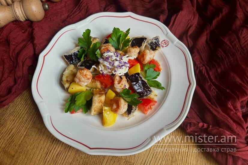 Хрусткий баклажан, свіже соковите манго та ніжна креветка.