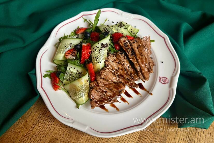 Соковита телятина, свіжа полуниця та мікс свіжої зелені.