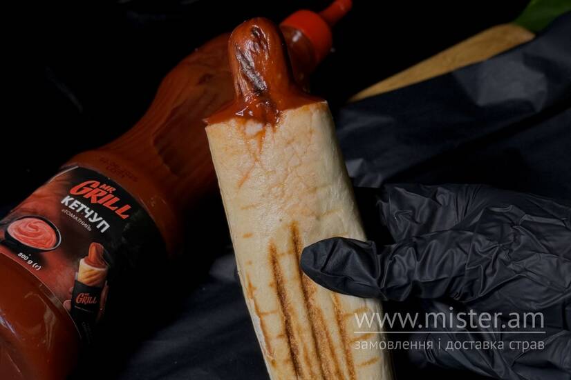 Булочка для хот-догу, сосиска, кетчуп, майонез, гірчиця.