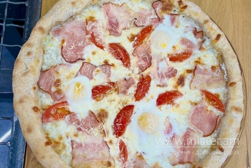 Ніжна піца з кремовим соусом, шматочками бекону, сиром моцарела. Вершковий смак підкреслює яйце, запечене до легкого кремового стану. Ароматна класика, яка перенесе вас до Італії.
