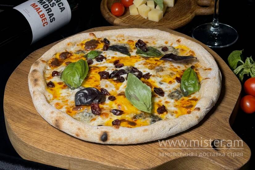 Піца на основі вершкового соусу, сиру моцарела, сиру пармезан, горгонзола та чеддер. Прикрашається в'яленою журавлиною, трюфельним медом та базиліком. Подається з соусом айолі папрікаш та сирним.