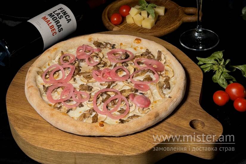 Піца на основі вершкового соусу, сиру моцарела, печериць та глив. Прикрашається трюфельною пастою та червоною маринованою цибулею. Подається з соусом айолі папрікаш та сирним.