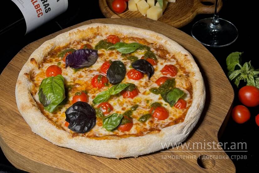 Піца на основі томатного соусу, сиру моцарела, томатів чері, сиру мармезан та соусом песто базилік. Прикрашається базиліком з додаванням часникової олії. Подається з соусом айолі папрікаш та сирним.