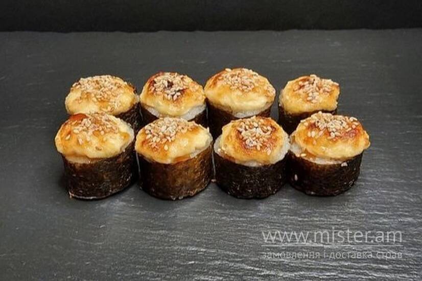 Рис, норі, крем-сир, огірок, курча, соус спайсі, фірмова сирна шапка, унагі, кунжут.