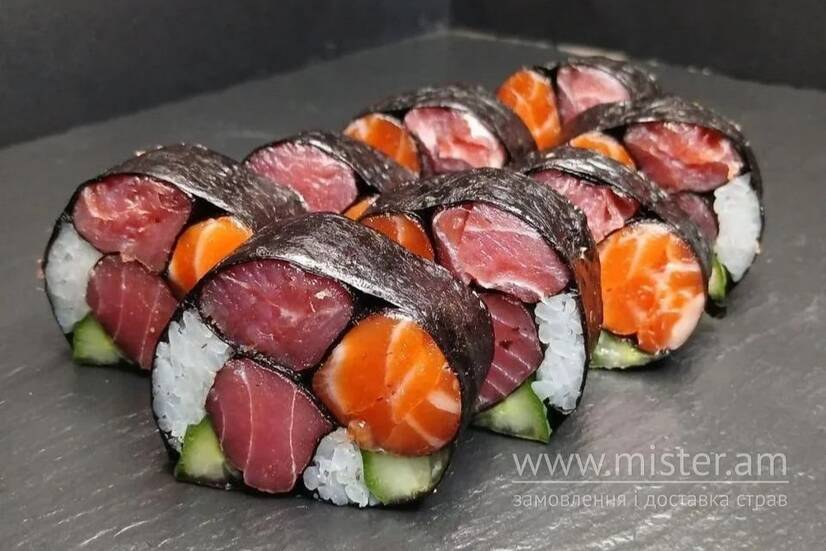 Рис, норі, огірок, лосось, тунець.