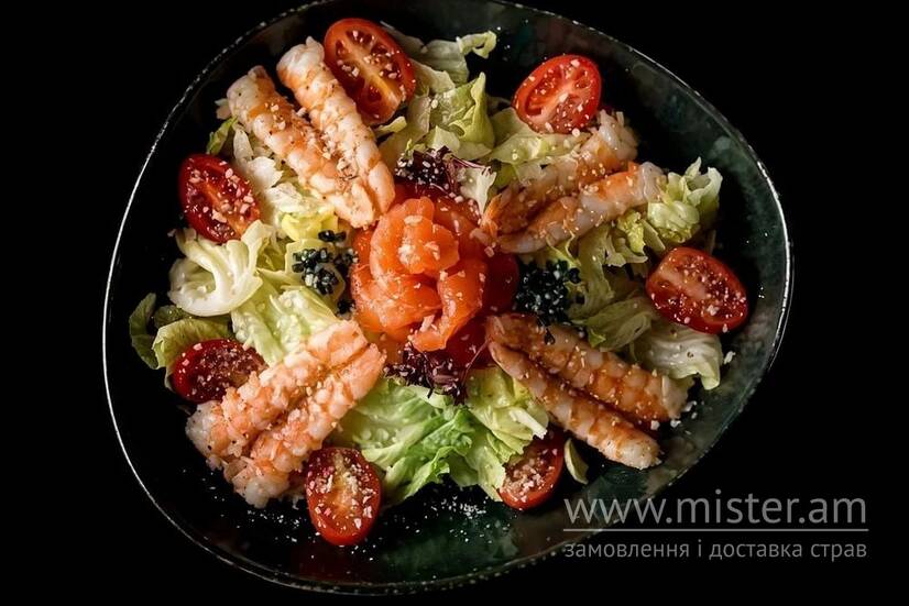 Соковитий лосось, ніжні креветки, листочки айсбергу, доповнені томатами, соус цезар, сухарики, пармезан.