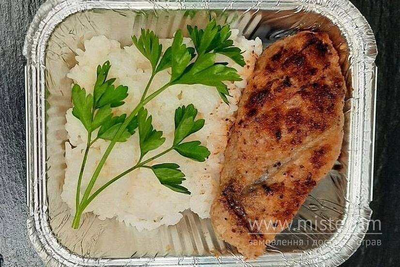 Домашня котлета гриль в поєднанні з рисом басматі, вершкове масло.