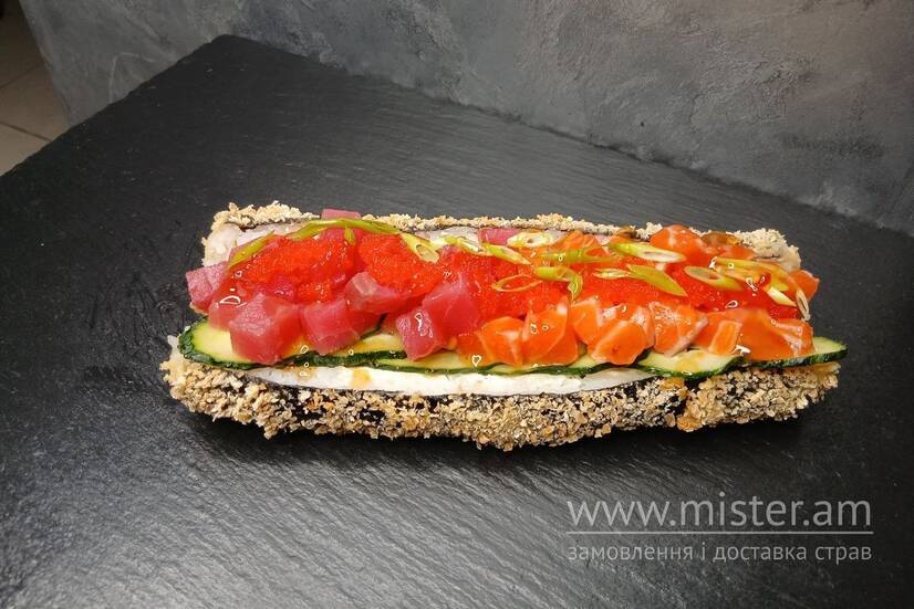 Лосось, тунець, рис, норі, крем-сир, огірок, хрустка паніровка, ікра масаго, зелена цибуля, соус спайсі.