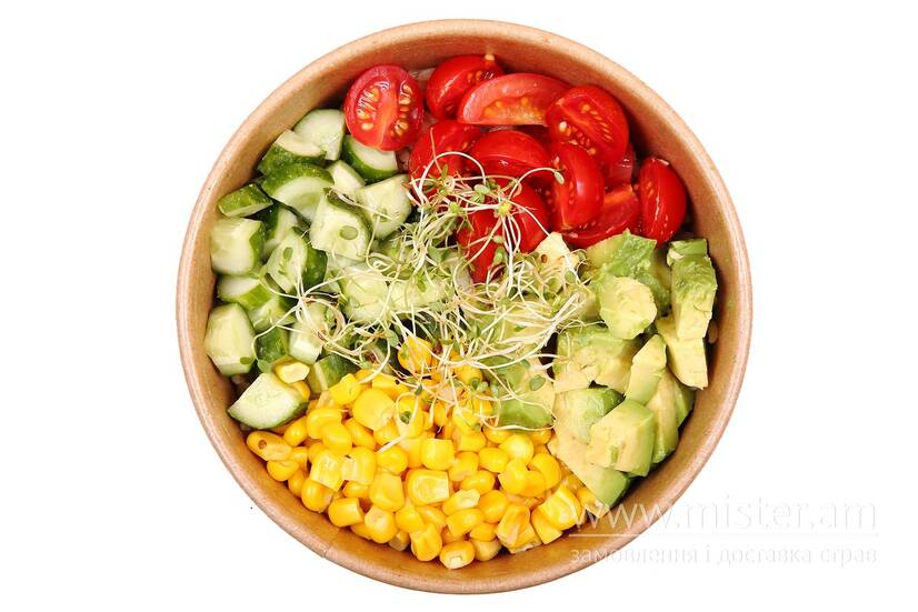 Авокадо, болгарський перець, кукурудза, огірок, помідор коктейльний, рис, соєвий соус.