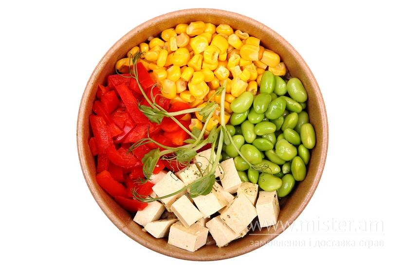 Боби едамаме, болгарський перець, кукурудза, рис, сир тофу, соєвий соус.