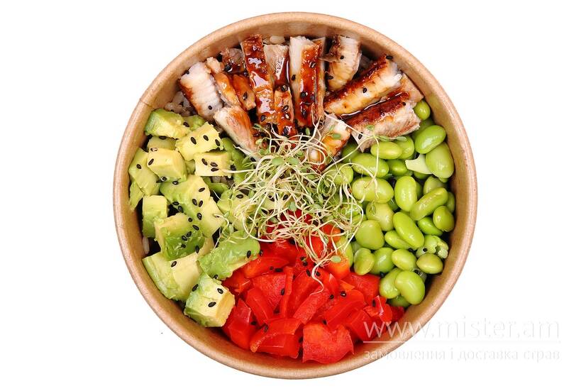 Авокадо, боби едамаме, болгарський перець, вугор, кунжут чорний, рис, соєвий соус, соус унагі.