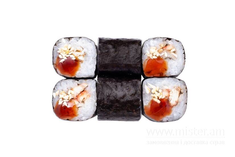Вугор, кунжут, норі, рис, соус унагі, васабі, імбир, соєвий соус.