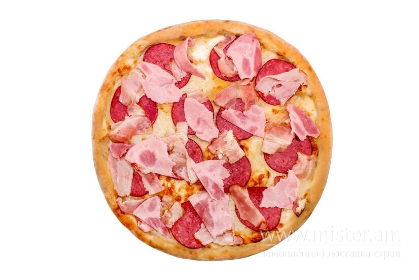 Бекон, вершки, моцарелла, салямі, часниковий соус, шинка.