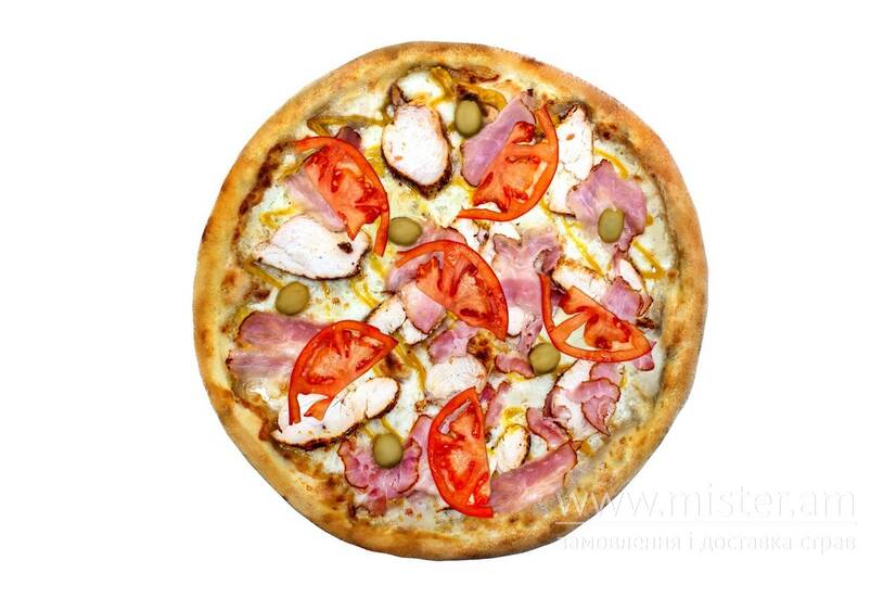 Бекон, вершки, гірчиця, курка, моцарелла, оливки, помідор.