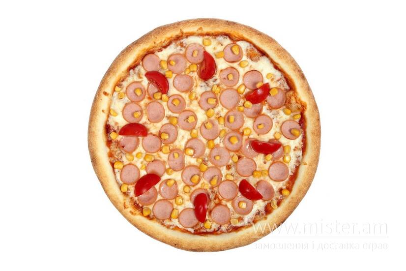 Кукурудза, моцарелла, перетерті томати, помідор коктейльний, сосиска.