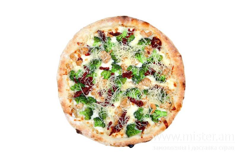Броколі, в'ялений помідор, вершки, курка, моцарелла, оливкове масло, пармезан.