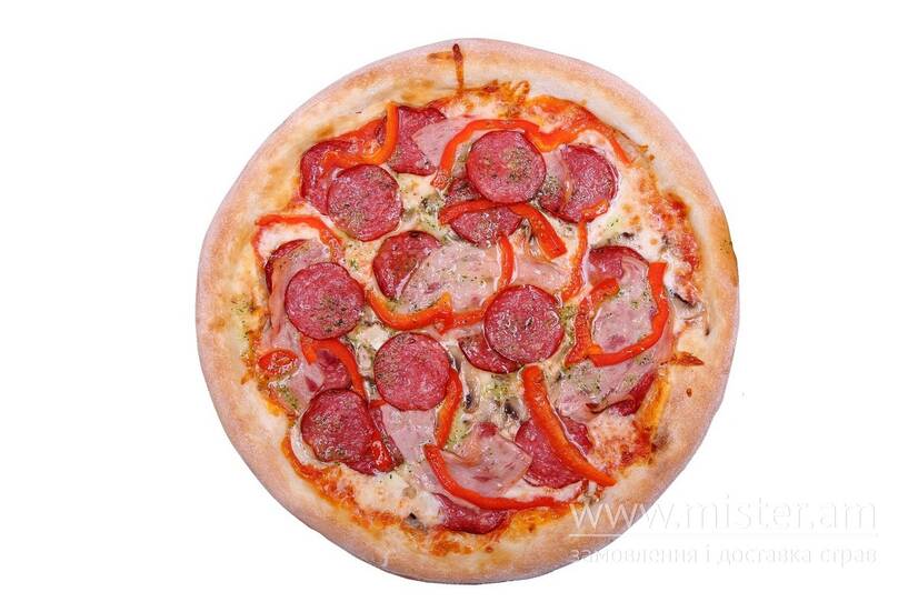 Болгарський перець, моцарелла, перетерті томати, печериці, салямі, часниковий соус, шинка.
