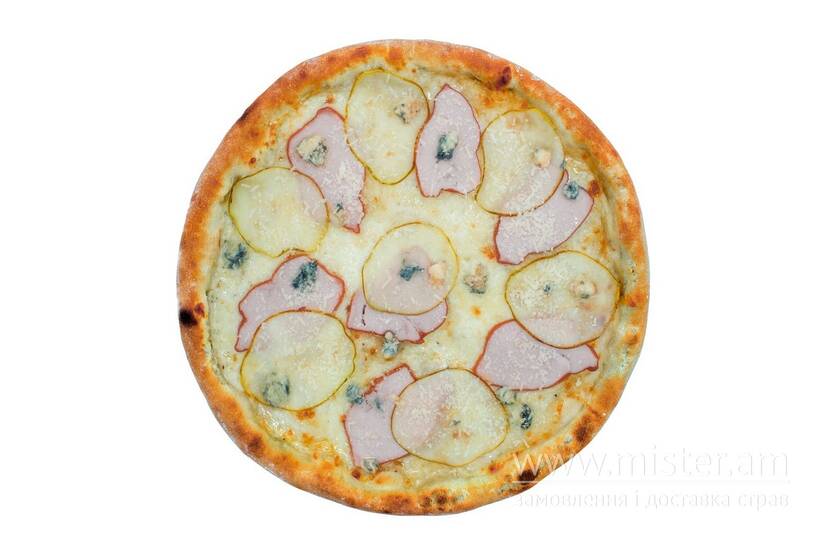 Вершки, горгонзола, груша, куряче копчене філе, моцарелла, пармезан.