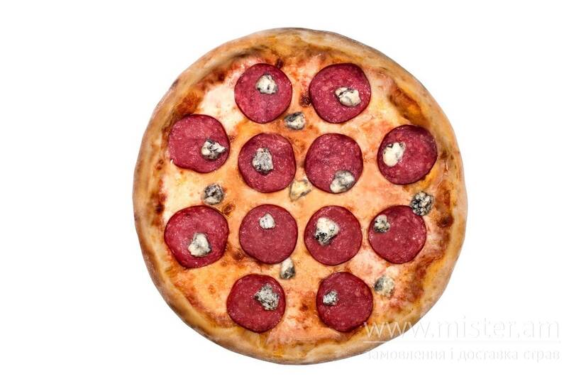 Горгонзола, моцарелла, перетерті томати, салямі.
