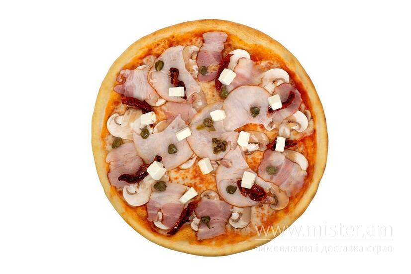 Бекон, в'ялений помідор, каперси, моцарелла, перетерті томати, печериці, рулет індичий, сир фета.