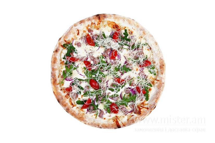 Вершки, моцарелла, пармезан, помідор коктейльний, рукола, тунець, червона цибуля.