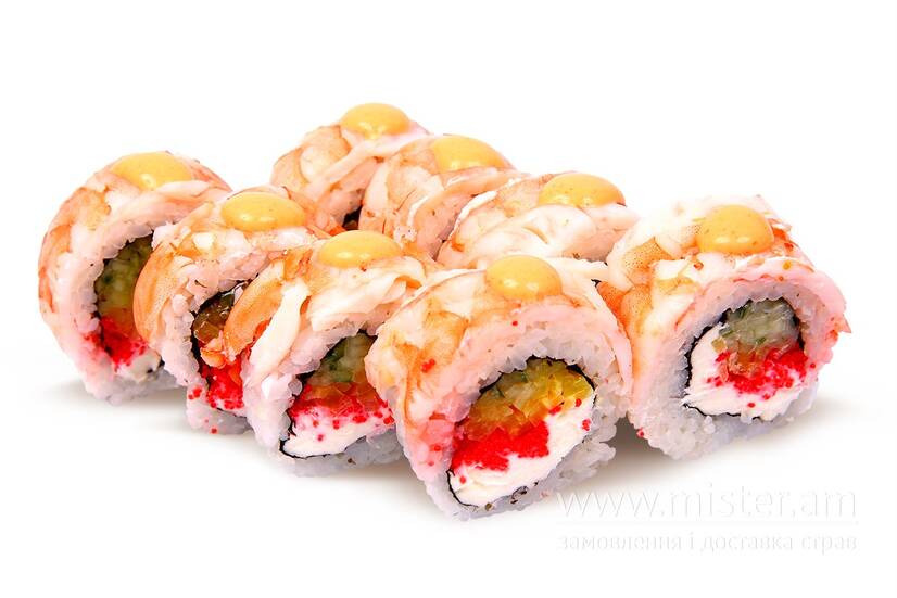 Дайкон, креветка Тигрова, крем-сир, масаго, норі, огірок, рис, соус спайс.