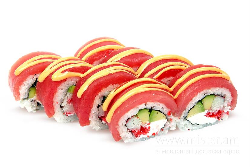 Авокадо, крем-сир, масаго, норі, рис, сніжний краб, соус спайс, тунець.