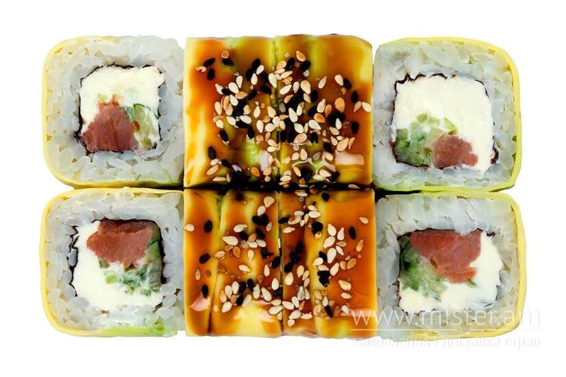 Авокадо, крем-сир, кунжут мікс, лосось копчений, норі, огірок, рис, соус унагі, васабі, імбир, соєвий соус.