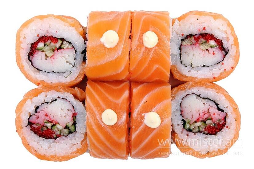 Крабова паличка, лосось, норі, огірок, рис, тобіко червона, японський майонез, васабі, імбир, соєвий соус.