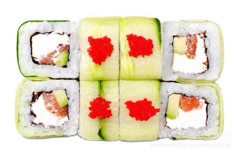 Авокадо, крем-сир, лосось, норі, огірок, рис, тобіко червона, васабі, імбир, соєвий соус.