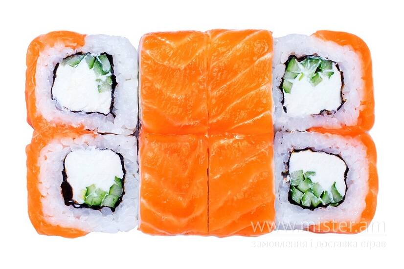 Крем-сир, лосось, норі, огірок, рис, васабі, імбир, соєвий соус.